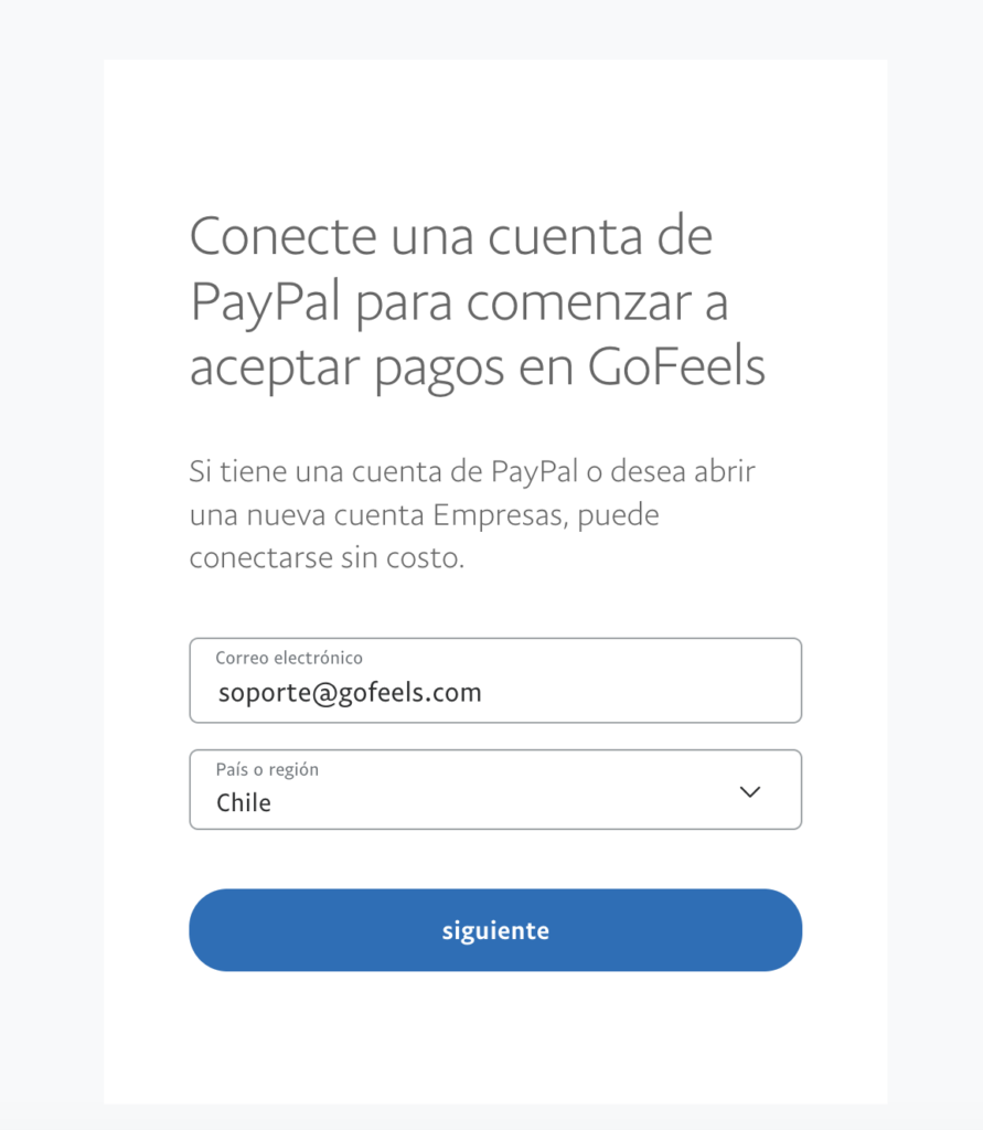 2. Si no tienes una cuenta de Paypal, te recomendamos realizar tu vinculación a través de nuestro equipo de Soporte (envía un correo a soporte@gofeels.com). Nuestro equipo te asistirá con los pasos necesarios para crear una cuenta.