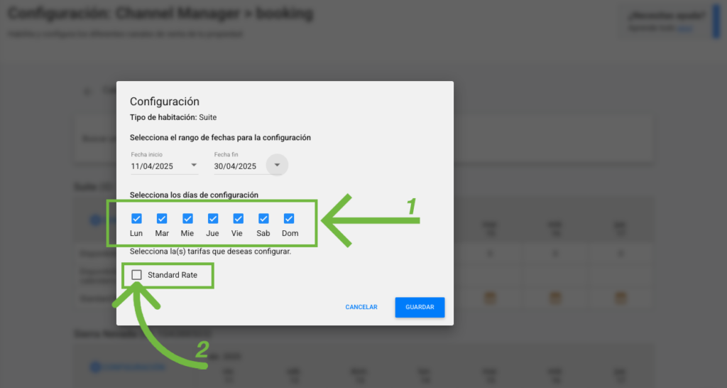 Paso 9: Además del rango de fechas, puedes seleccionar días de la semana en especifico, por defecto todos los días estarán seleccionados (1). Para continuar con la configuración, haz clic en la casilla correspondiente a la Tarifa que deseas configurar (2).
