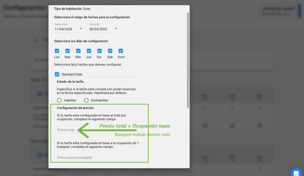 El Precio total, se refiere al precio de la Ocupación base / Ocupación Estándar, definida previamente en tu configuración de Booking.
