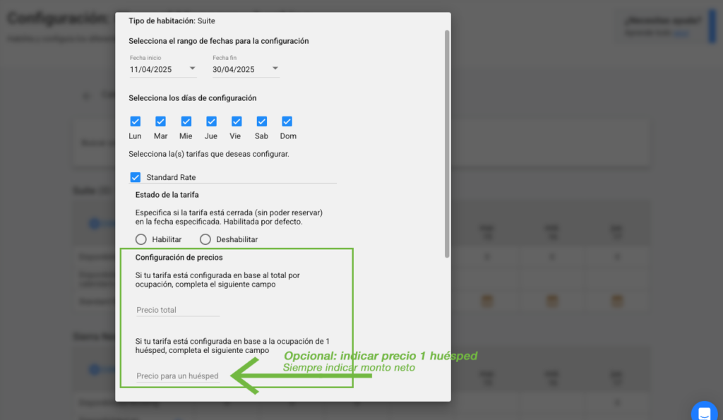 Paso 11: Si lo deseas, puedes definir también el precio para 1 huésped, siempre que no tengas configurados Precios Por Persona en tu cuenta de Booking. Recuerda que el monto ingresado aquí es complementario al Precio total, y debe estar en la misma moneda y en monto neto.