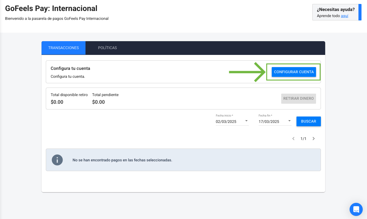 Paso 4: Una vez hayas hecho clic en «Configurar cuenta» se abrirá una nueva pestaña en tu navegador, para iniciar el proceso de configuración y validación de tu cuenta para recibir pagos internacionales a través de GoFeels.com.