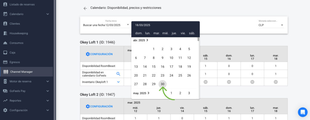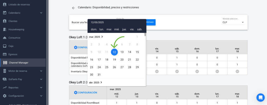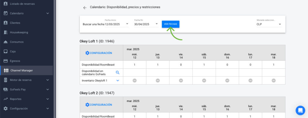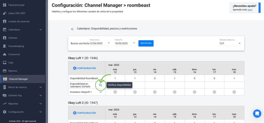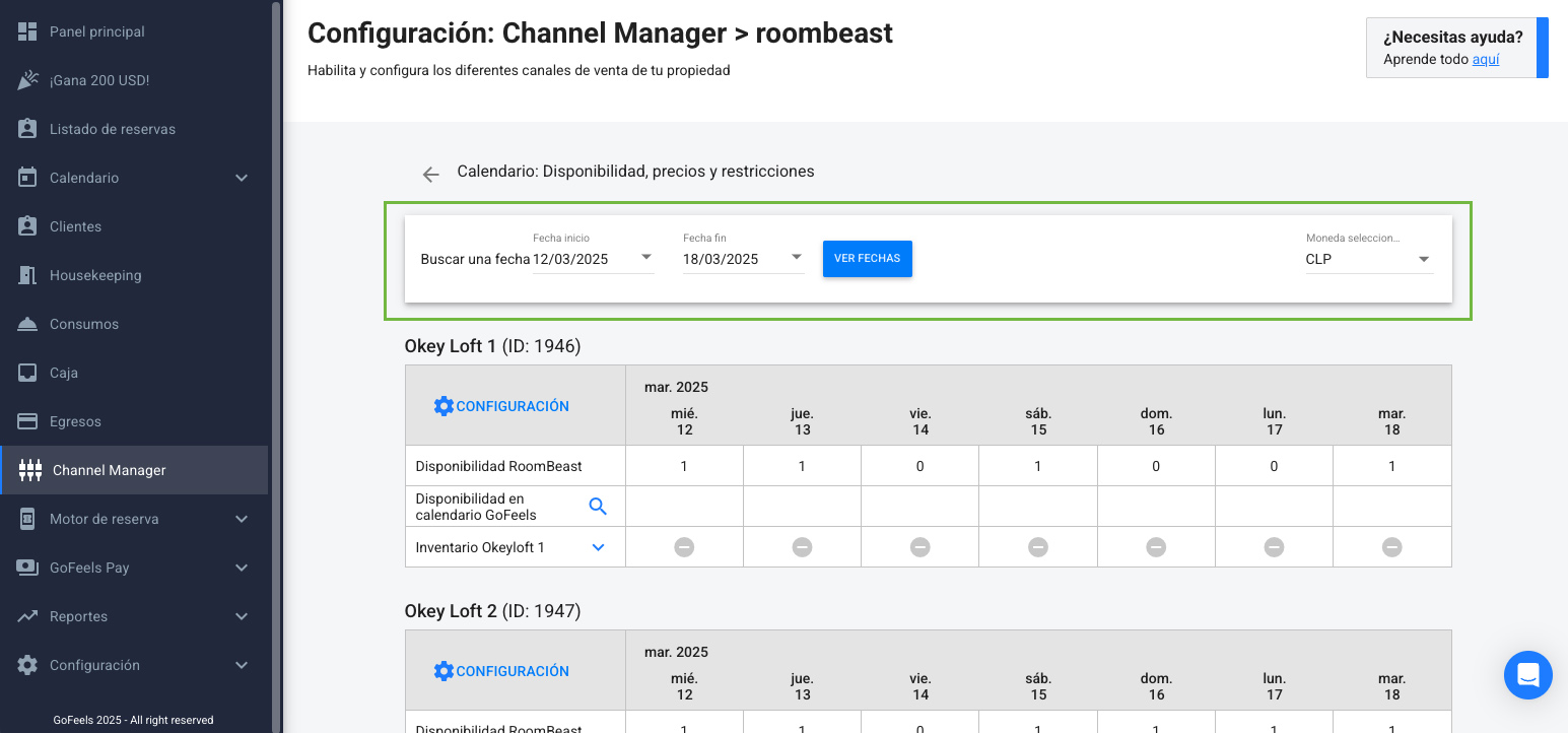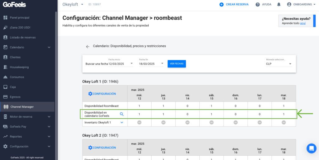 Al pasar el tiempo, se debe agregar disponibilidad para fechas futuras para Roombeast desde GoFeels (proceso explicado en la guía ¿Cómo configurar disponibilidad para Roombeast?). Pero si vas a realizar la configuración y necesitas conocer la disponibilidad real de la propiedad, en sus distintos tipos de habitaciones, hemos agregado una fila adicional: a la configuración de Disponibilidad y precios para el canal de Roombeast.